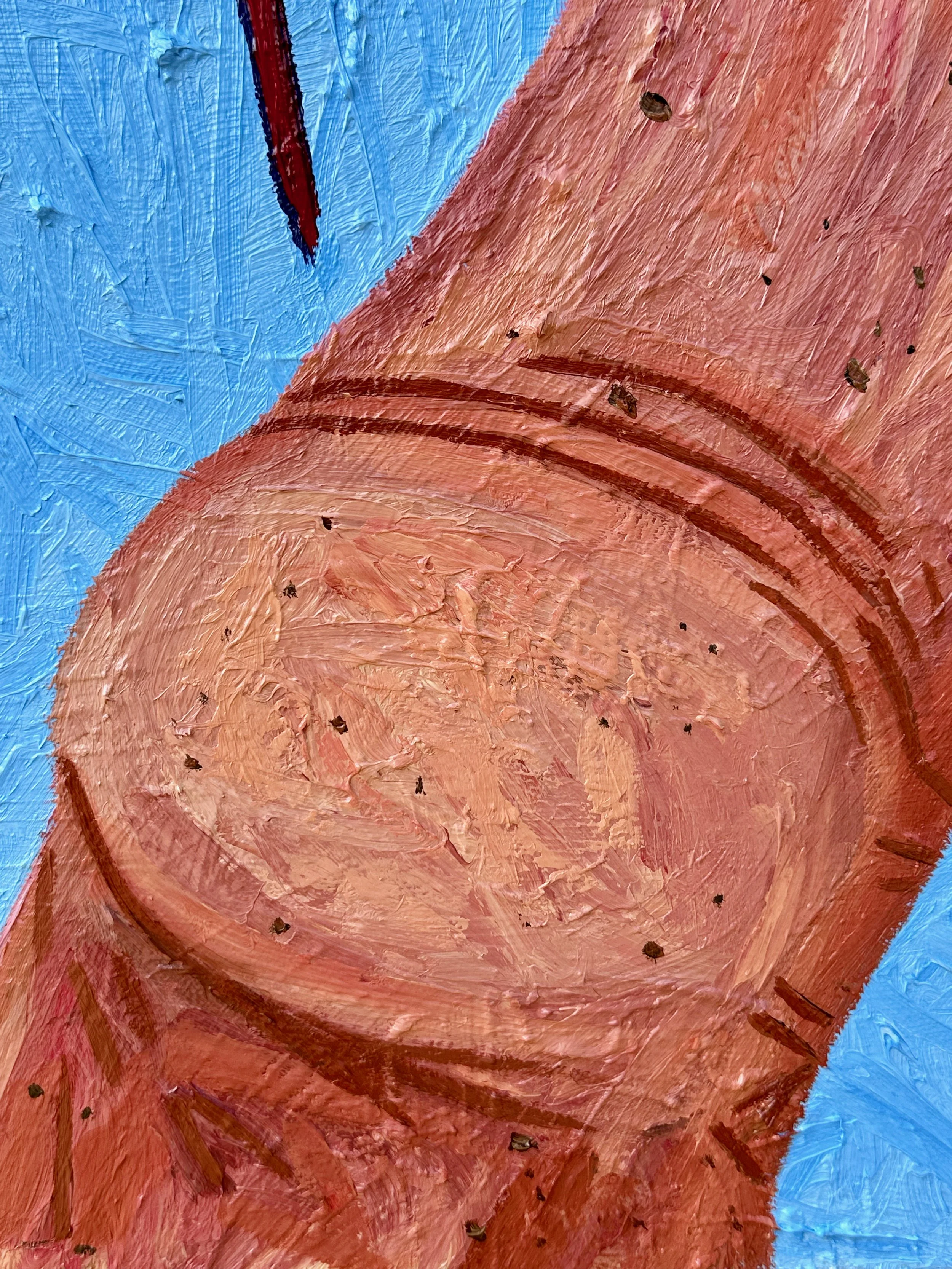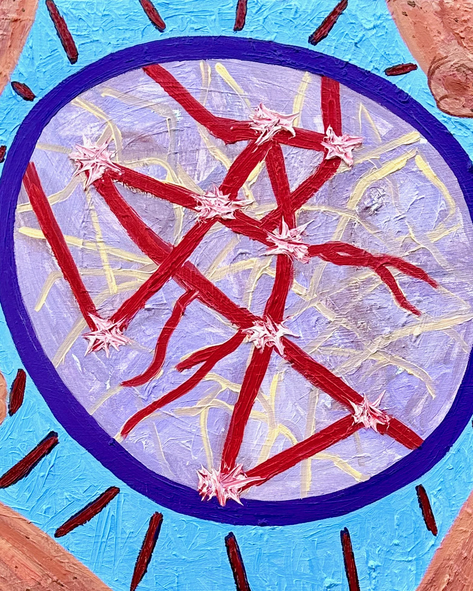 This painting explores what happens when a seizure occurs. It shows the moment when signals in the brain misfire, setting off a chain reaction that takes over the body. Neurons spark, limbs convulse, and everything slips out of sync as you lose consciousness. It's about that sudden loss of control — when the body moves without permission, and the brain turns into a storm of electrical activity.