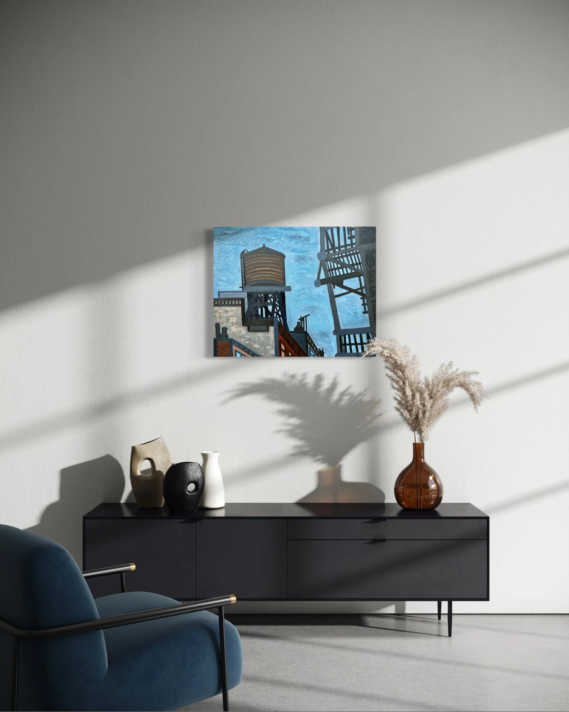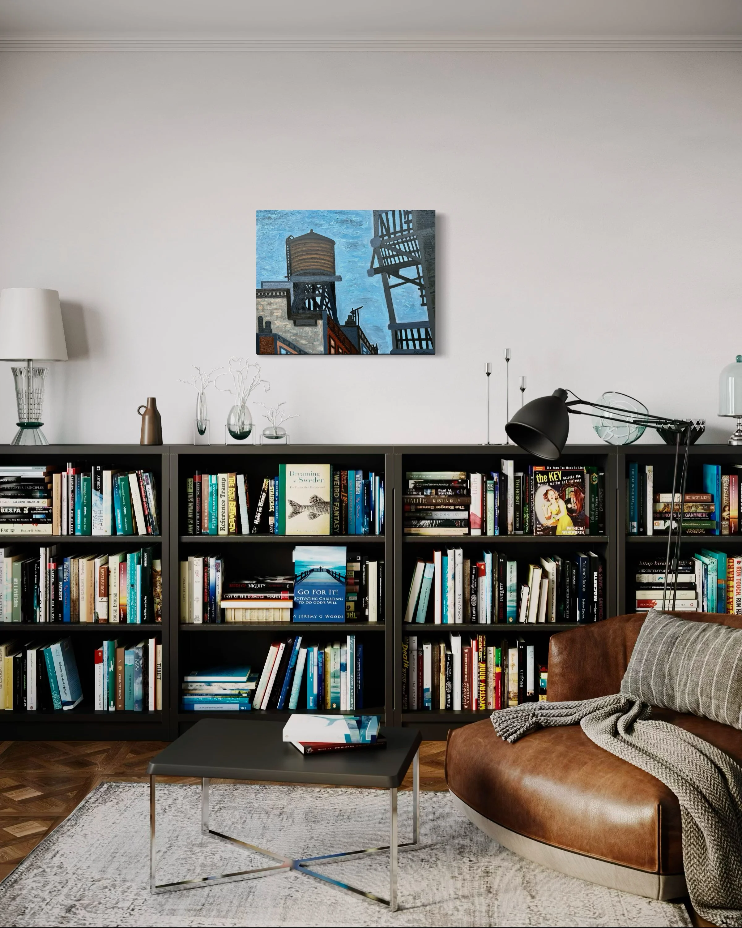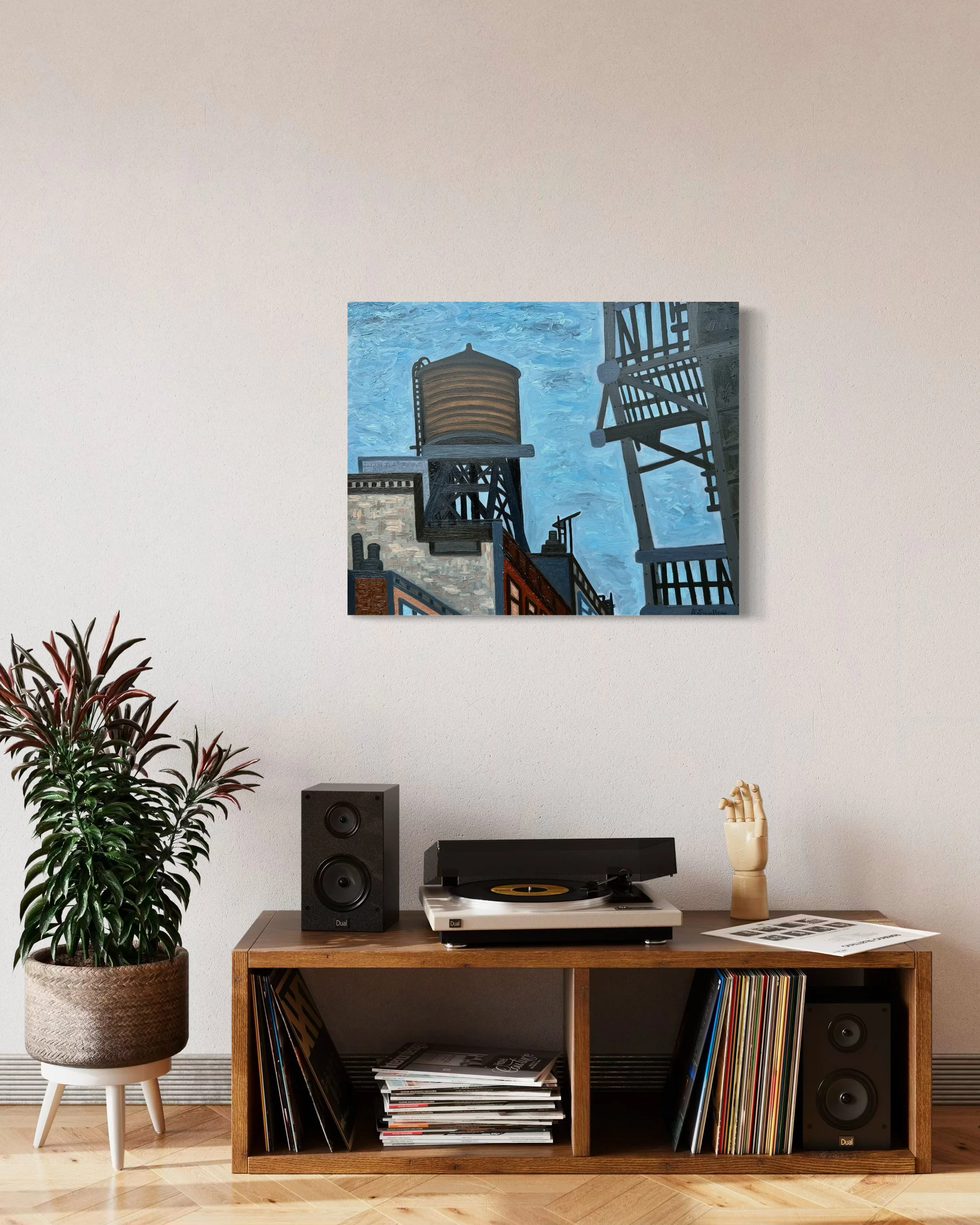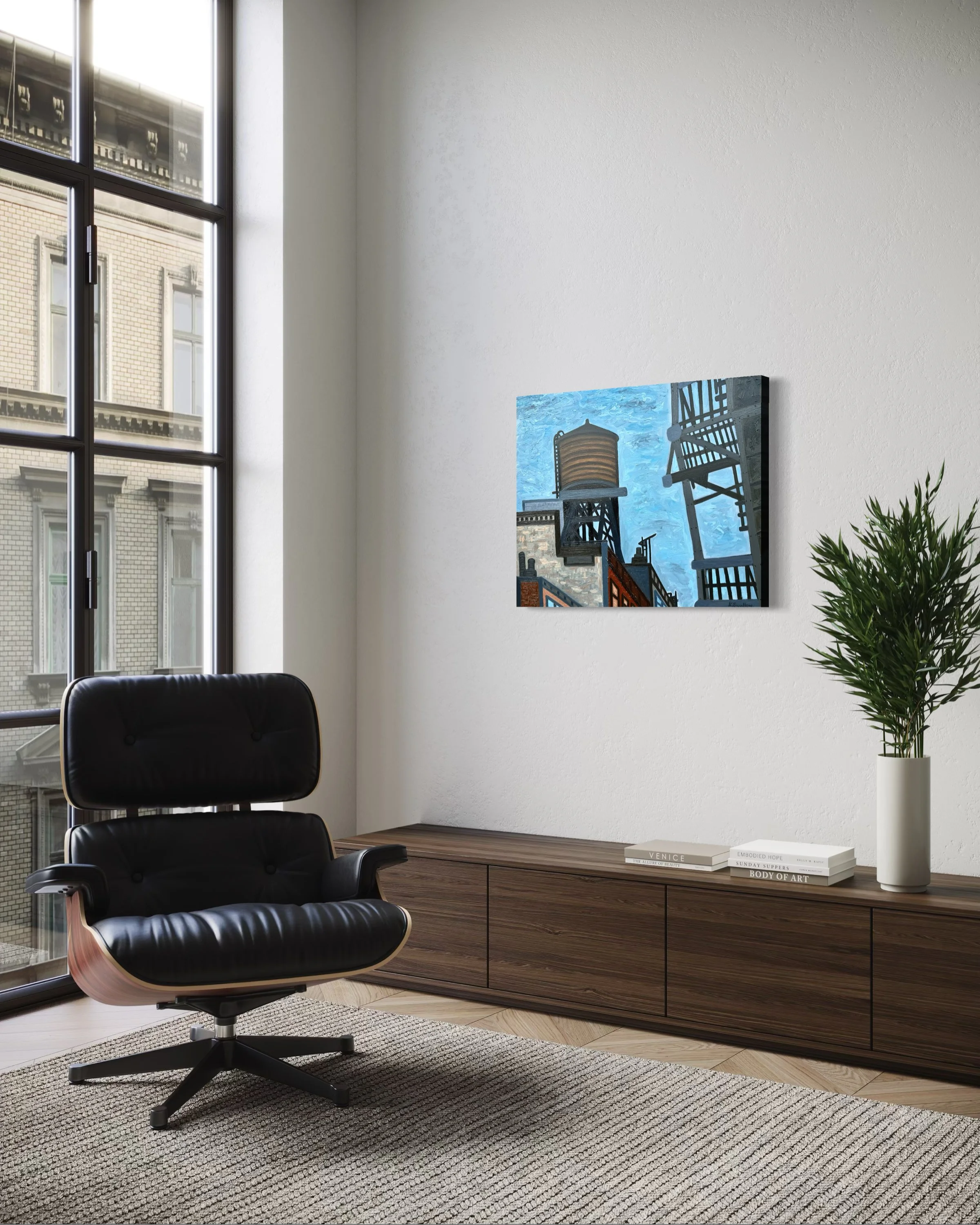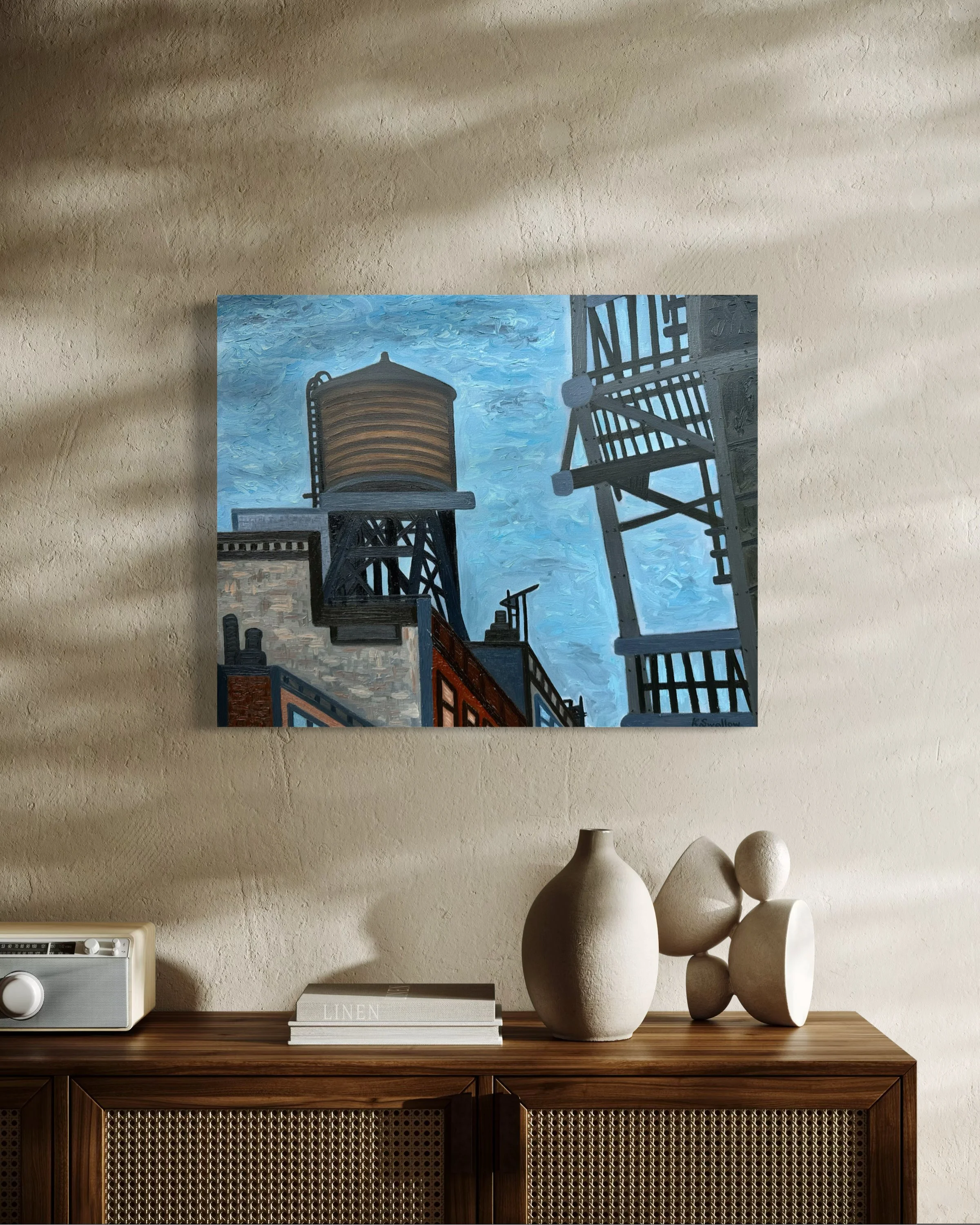 This New York cityscape is based on a photo I took last year while wandering through the East Village, shooting street scenes and architecture along the Bowery before heading over to SoHo for a slice of thin crust and a beer at Spring Street Lounge. That stretch of downtown Manhattan has always captivated me — the original buildings and rooftop water tanks still standing, the layers of history, the mix of cultures, and the artists and musicians who have long called it home. What makes it endlessly interesting, though, is how all of that is beginning to collide with newer architecture, creating unexpected juxtapositions around every corner. Every visit brings something different, but what I keep coming back to capture is that unmistakable old New York.