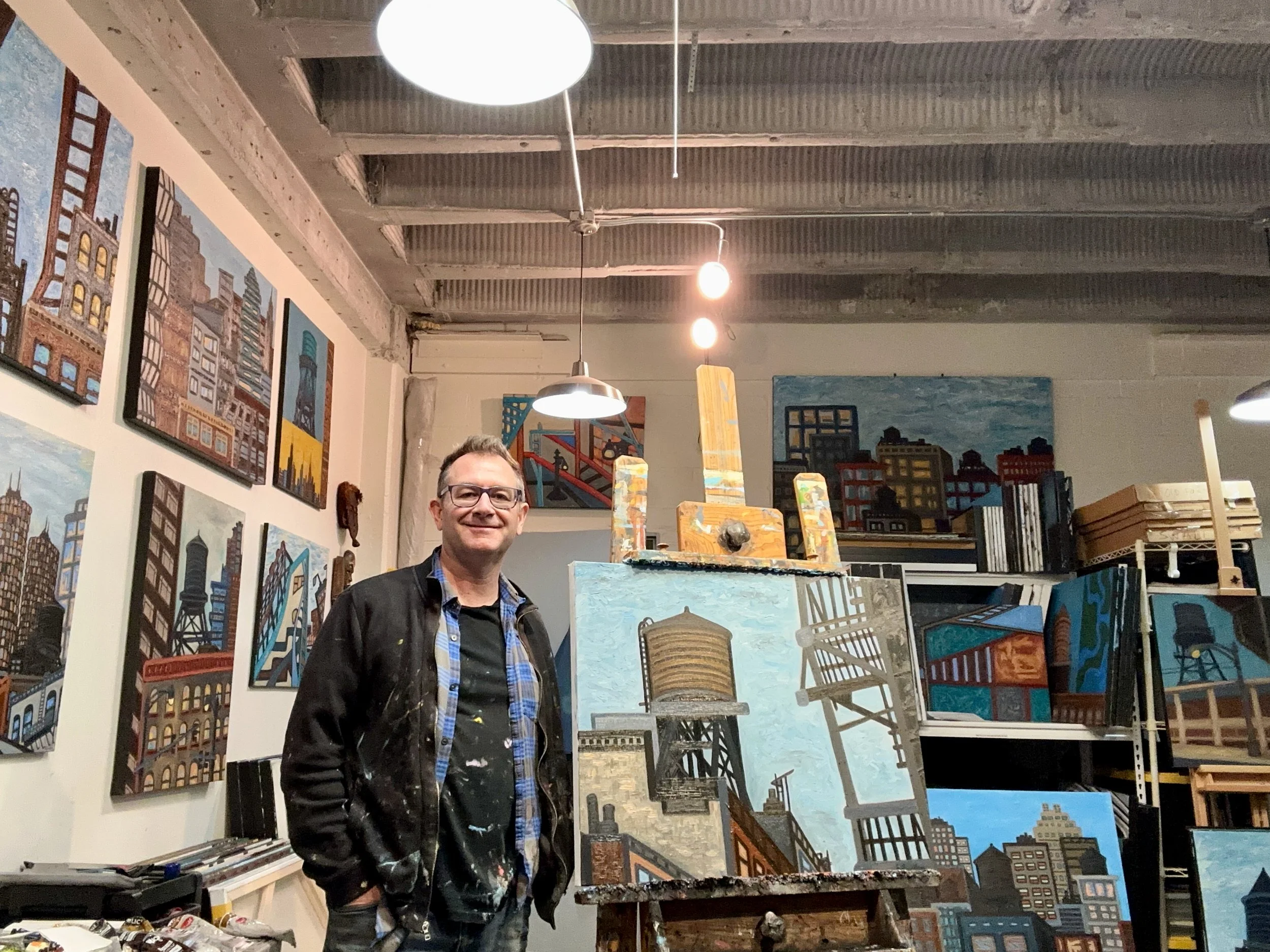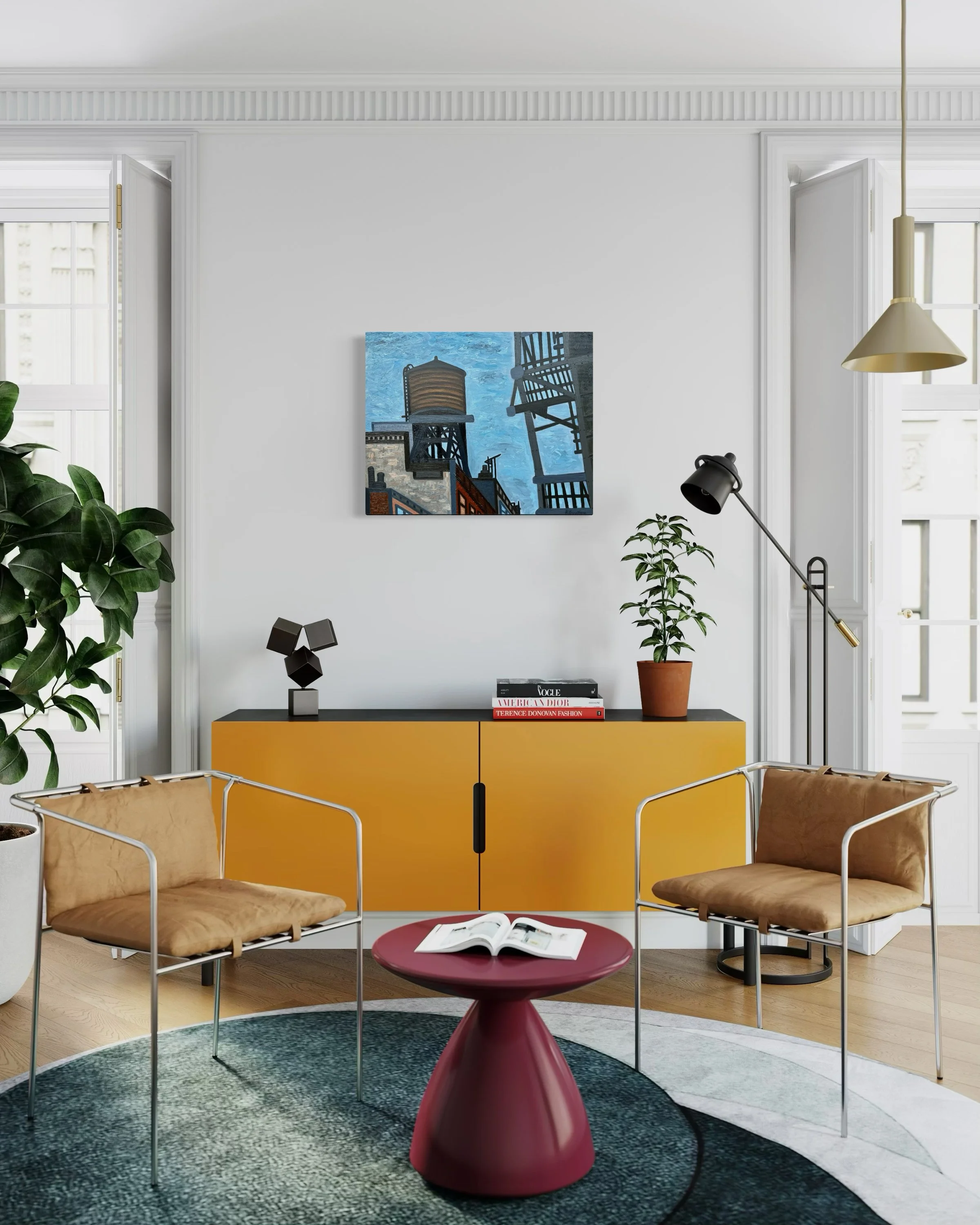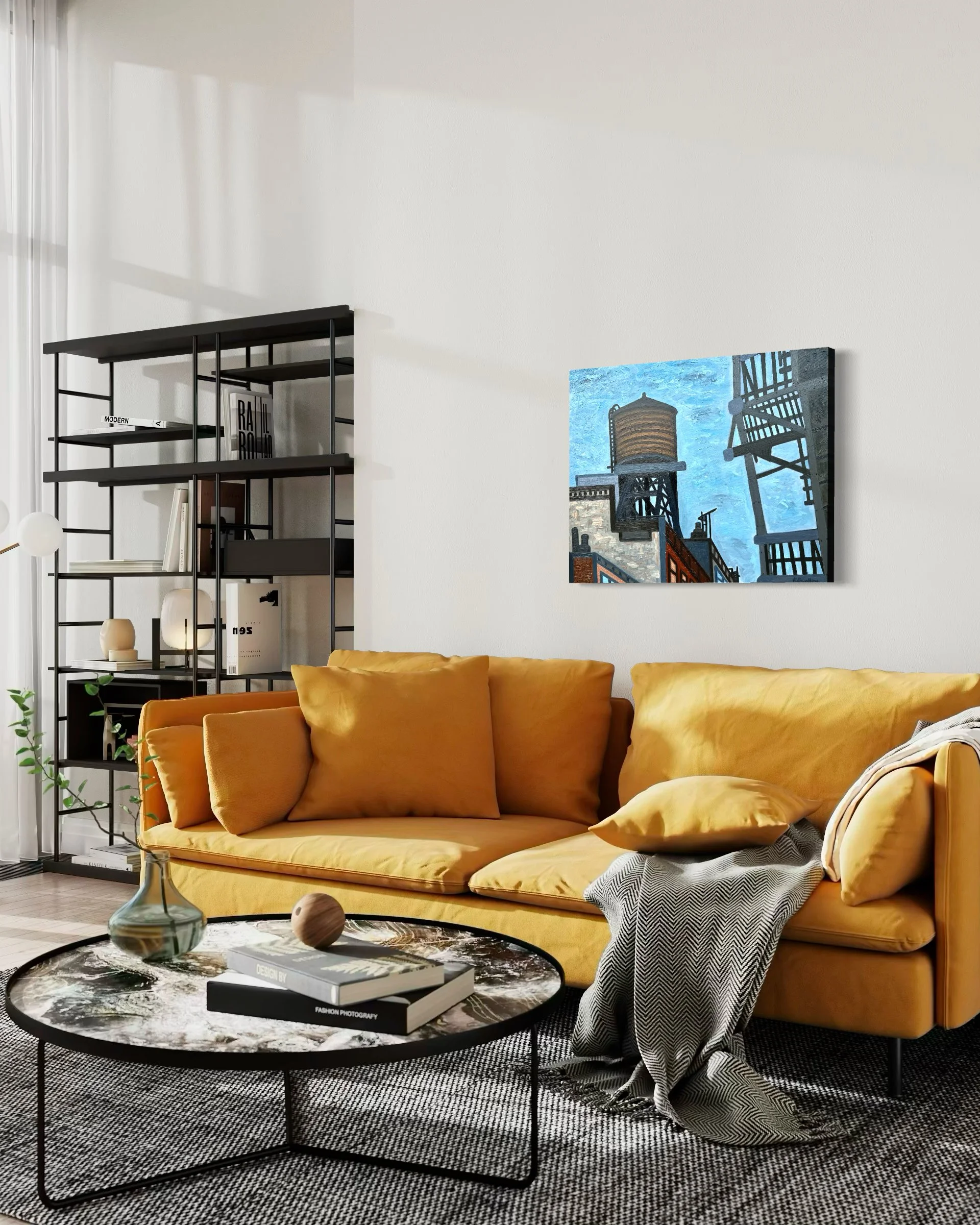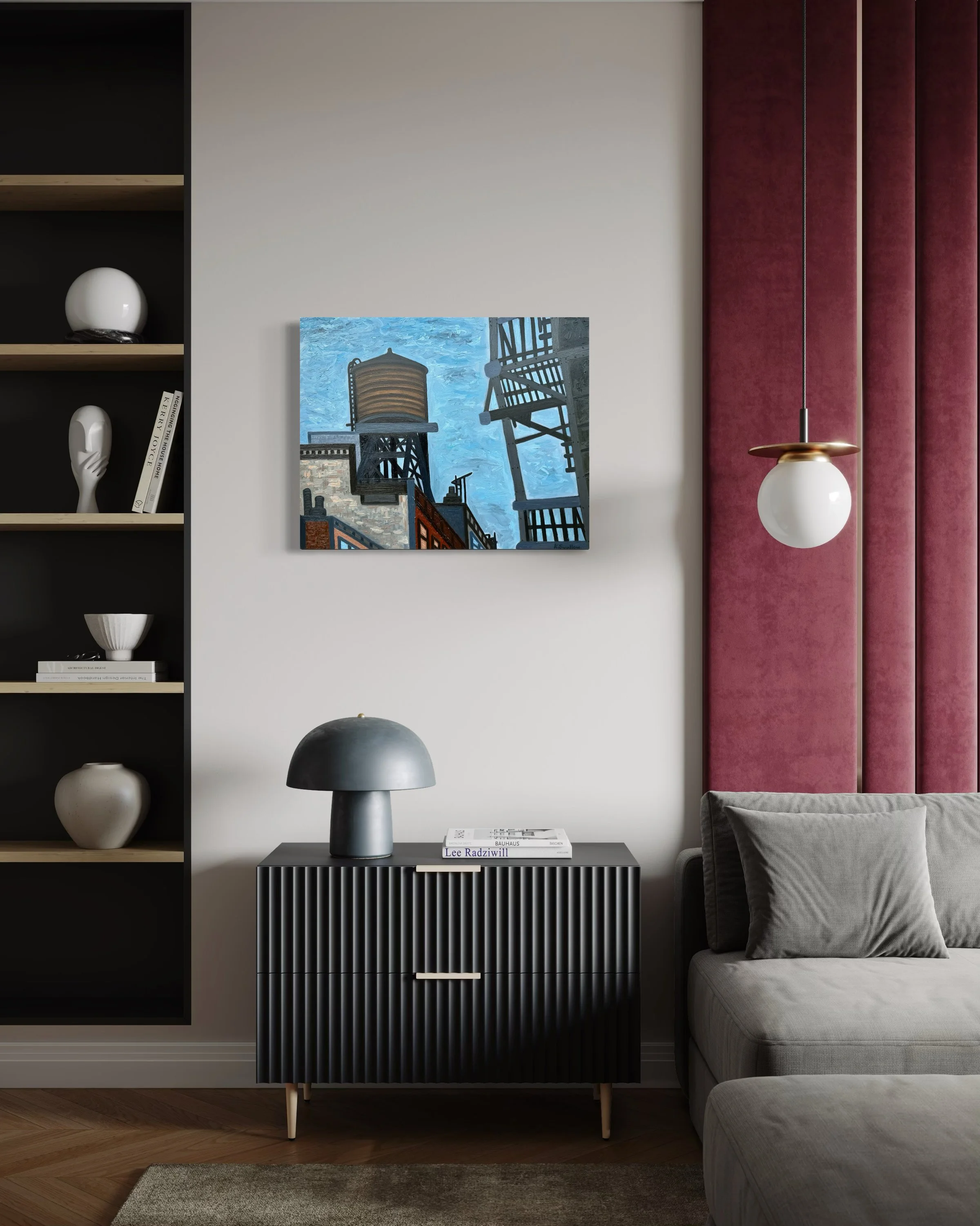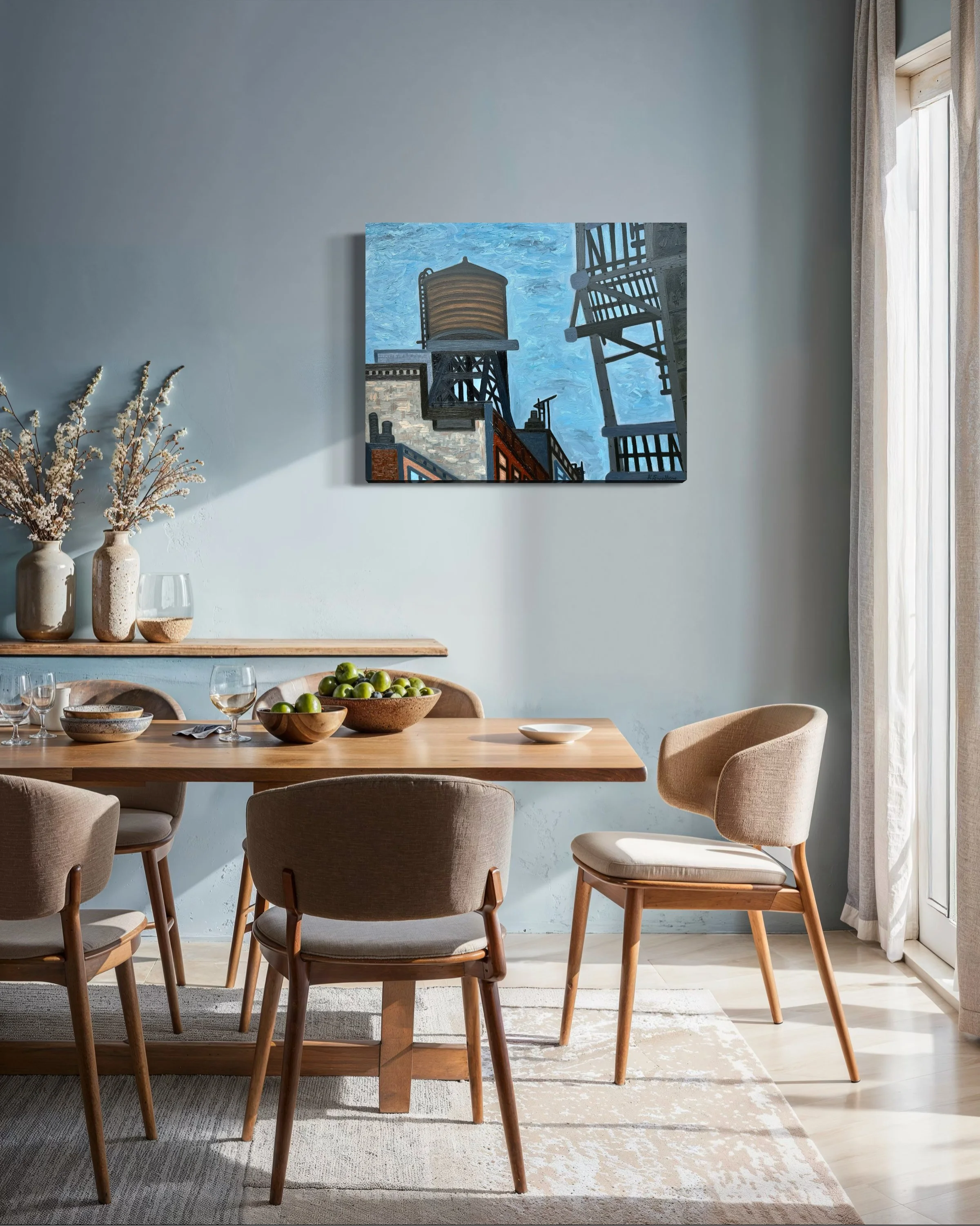 This New York cityscape is based on a photo I took last year while wandering through the East Village, shooting street scenes and architecture along the Bowery before heading over to SoHo for a slice of thin crust and a beer at Spring Street Lounge. That stretch of downtown Manhattan has always captivated me — the original buildings and rooftop water tanks still standing, the layers of history, the mix of cultures, and the artists and musicians who have long called it home. What makes it endlessly interesting, though, is how all of that is beginning to collide with newer architecture, creating unexpected juxtapositions around every corner. Every visit brings something different, but what I keep coming back to capture is that unmistakable old New York.