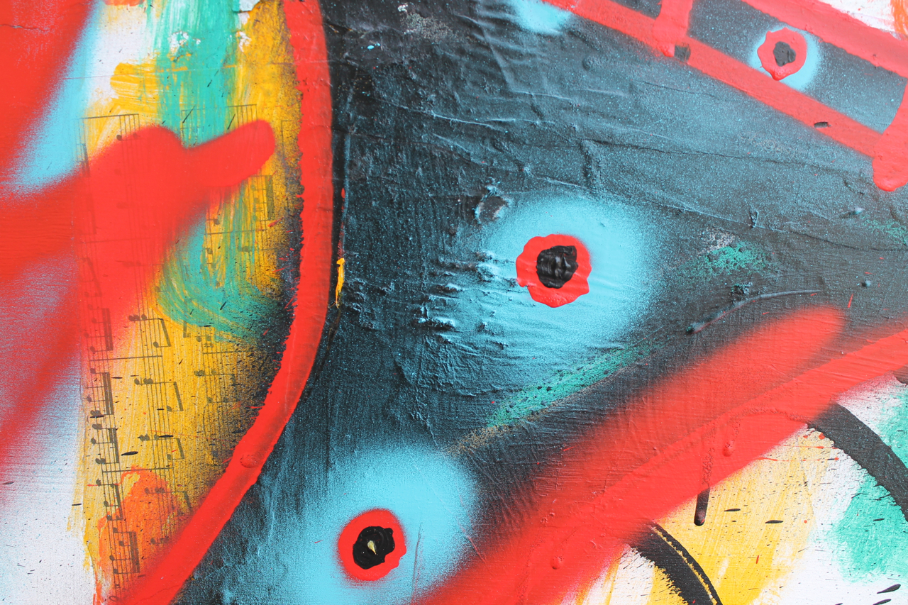 Rooftop Jam, acrylic, spray paint and collage on panel, 36x24, 2013