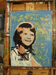 This work in progress mixed media piece on panel is a combination of acrylic paint, screen print, and image transfer. The image transfer is from a 1975 photograph just after I turned 4 years old.